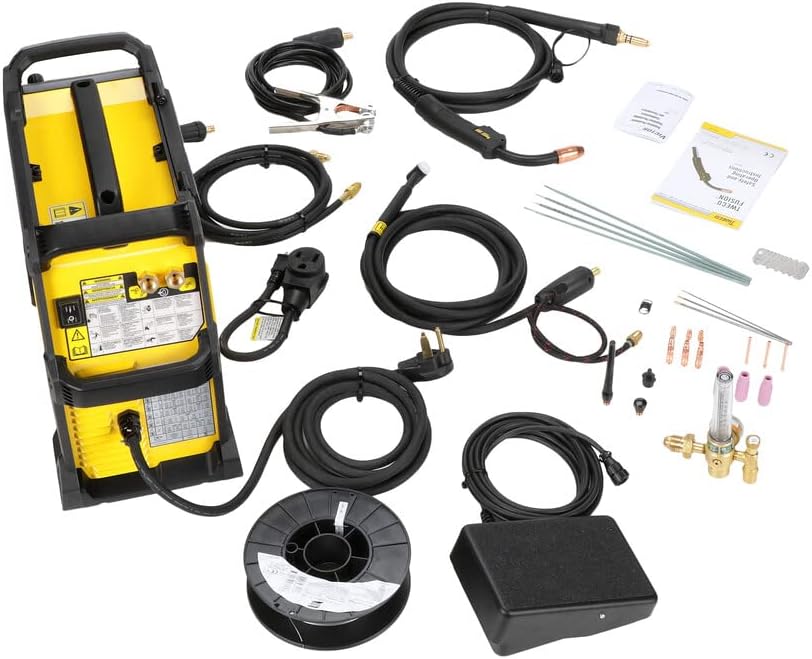 Kit Includes: Contact Tips, Flow Gauge/Regulator & Gas Hose, MIG Gun, Solid Wire, Stick Electrode Holder with Cable, Stick Electrodes, TIG Torch, Wireless Foot Control, Work Cable with Clamp