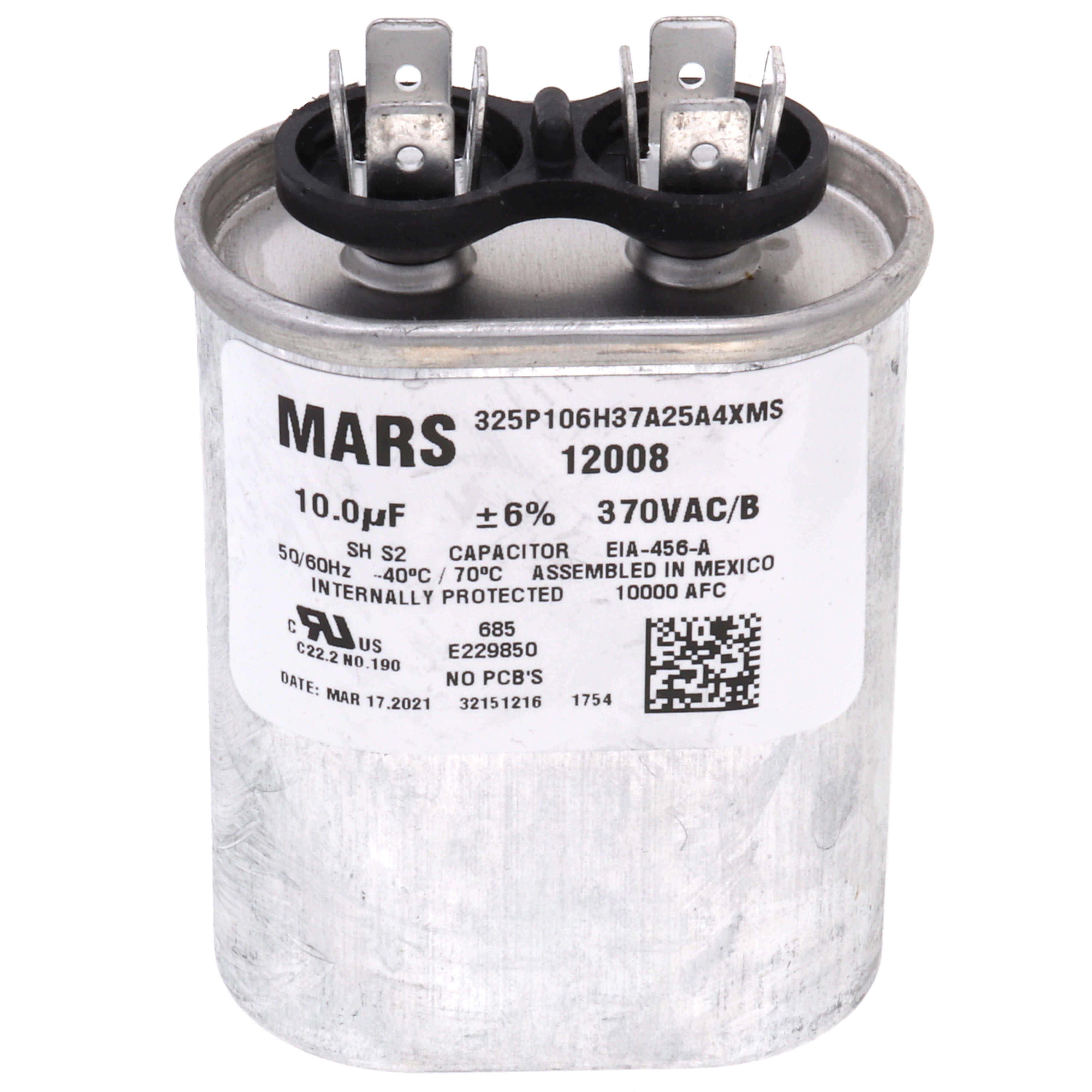 The MARS 12008 is a 10 MFD 370V oval run capacitor designed for HVAC systems. It is suitable for general replacements and has non-PCB construction for safety. This capacitor provides reliable performance in various applications.