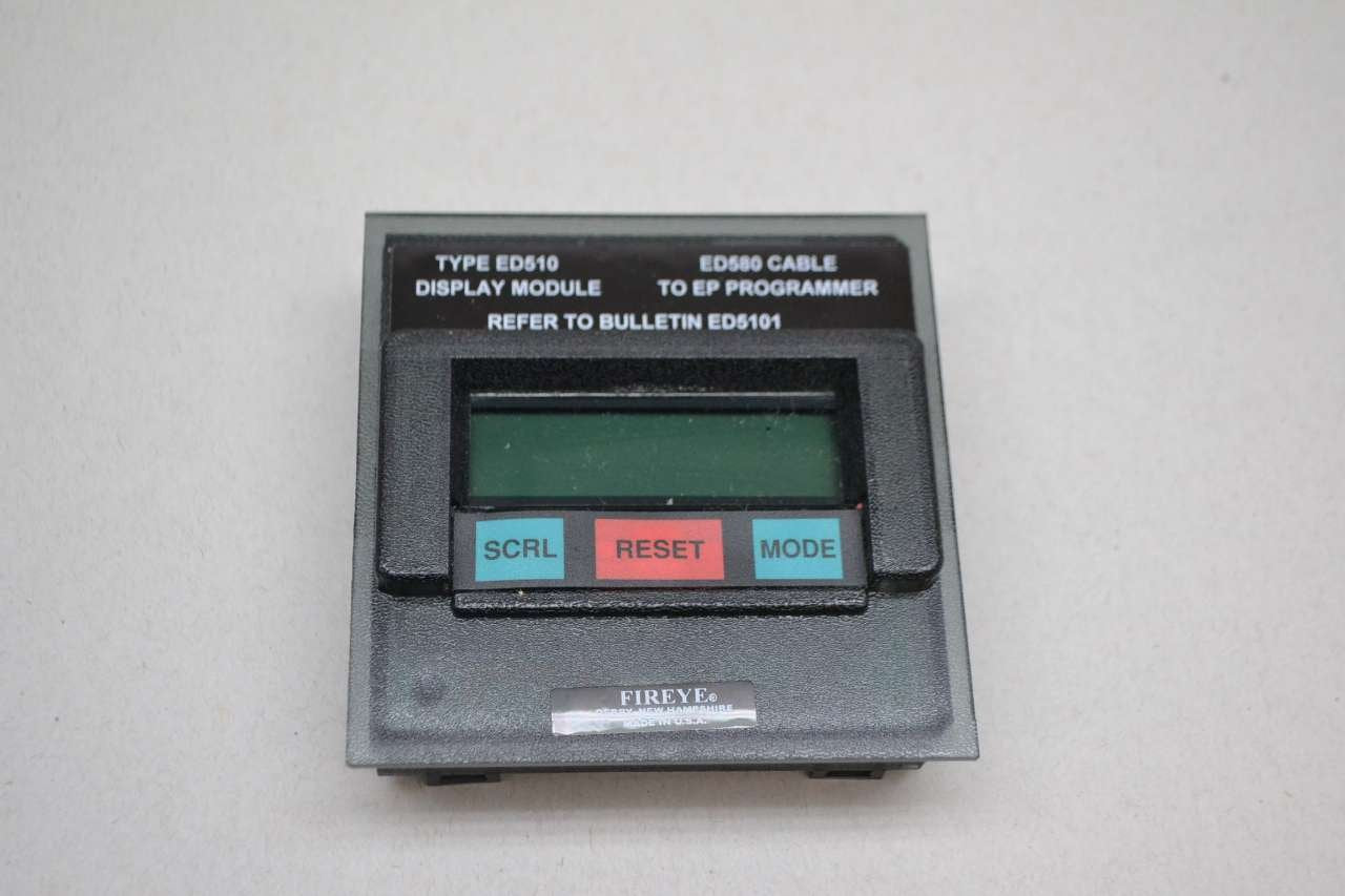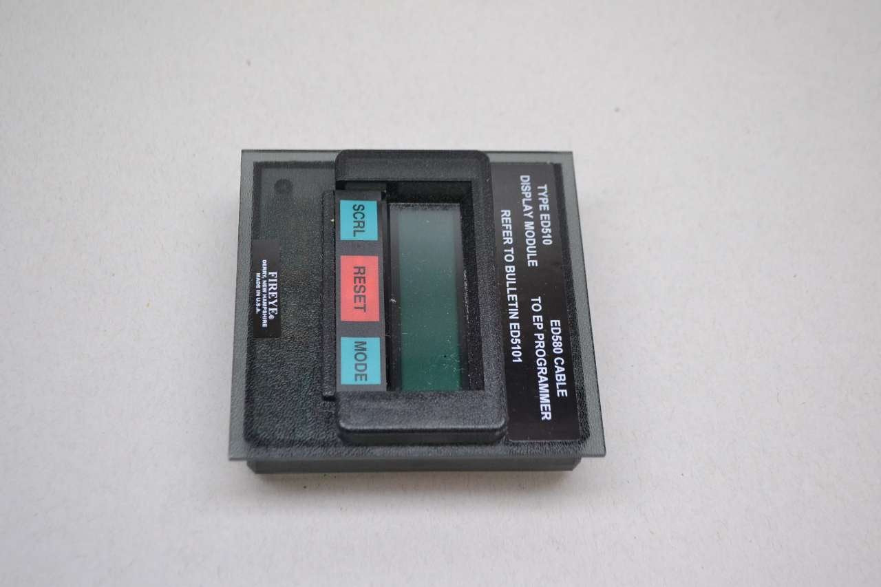 The Fireye ED510 is a display module featuring a two-line, 16-character LCD screen and a built-in keypad. It is designed for industrial applications and fits seamlessly with Fireye program modules, especially those with a phone plug on the top.