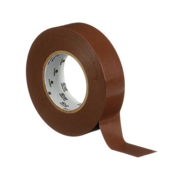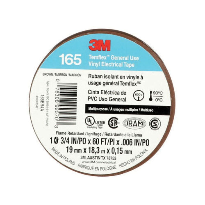 3M 165BR4A vinyl electrical tape is a multi-purpose flame-retardant insulating tape. This tape measures sixty feet in length and three-fourths of an inch in width. It has a thickness of six mils and features a rubber adhesive with a PVC backing.