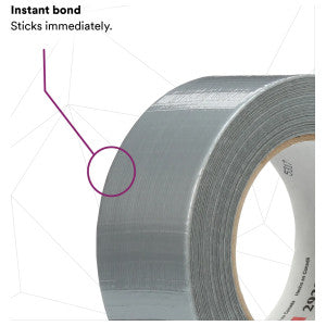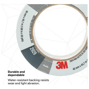 The 3M Utility Duct Tape, model 2929-SILVER-48MM, measures fifty yards long and one point eighty-eight inches wide. This tape is suitable for temporary repairs, sealing, holding, and marking. It features a polyethylene backing that resists moisture, enhancing the adhesive bond in humid or damp environments. The rubber adhesive provides strong adhesion to a variety of surfaces, making it versatile for different applications. The tape tears easily for convenience, and each roll is wrapped to maintain integrity and minimize waste.