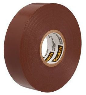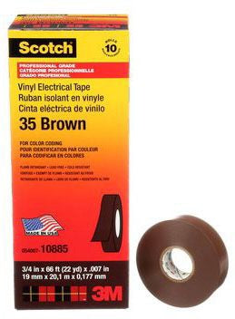The 3M 35-BROWN-3/4 is a vinyl insulating electrical tape. It is designed for use in various electrical applications and features a voltage rating of six hundred volts. The tape measures three-fourths inches wide and sixty-six feet in length.