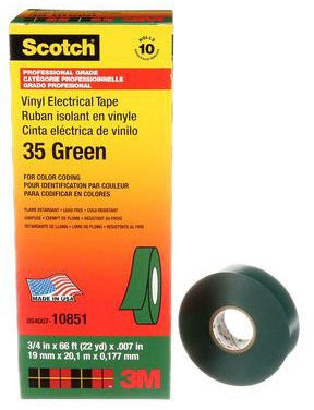 The 3M 35-GREEN-3/4 is a 3/4 inch by 66 foot electrical tape designed for insulation and color coding. It features a voltage rating of 600 volts and is made from durable vinyl material. This tape is suitable for phase identification, marking safety areas, and color coding of motor leads and piping systems.