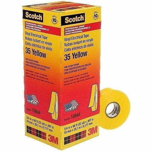 3M 35-YELLOW-3/4X66FT is a vinyl color-coding electrical tape, designed for various electrical tasks. This tape is made by 3M, a respected manufacturer in the industry. It has a size of three-fourths of an inch by sixty-six feet. The tape provides excellent protection and is suitable for phase identification and color coding electrical leads and piping.