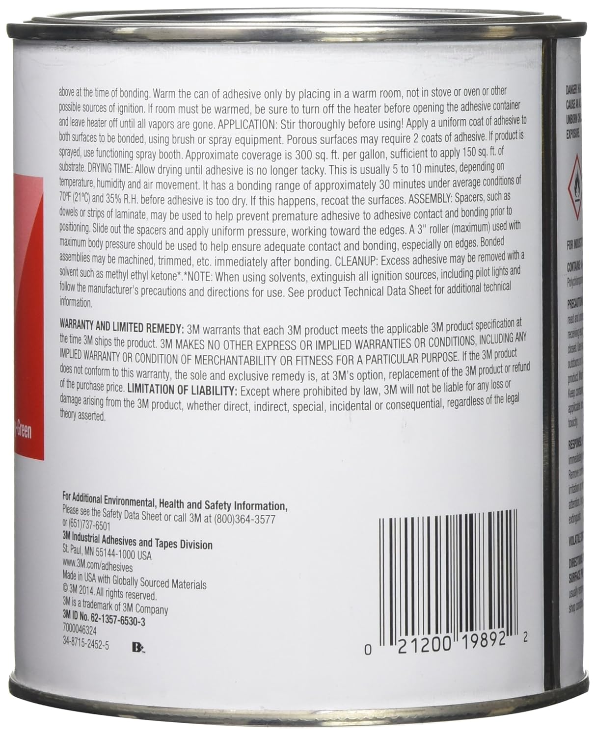 The 3M Neoprene High Performance Contact Adhesive 1357 is suitable for various materials. This adhesive comes in a one quart can and is gray-green in color. It is ideal for bonding aluminum, stainless steel, steel, and plastics. Professionals use this adhesive in the fields of manufacturing, repair, and maintenance.