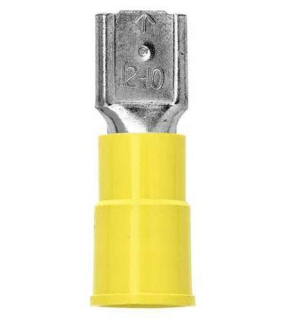 The 3M Highland Vinyl Insulated Female Disconnect Terminal with MPN 7000133661 is suitable for wire connections in various electrical applications. This terminal features a vinyl-insulated, butted-seam barrel that can withstand temperatures from negative forty to two hundred twenty-one degrees Fahrenheit. Its brass construction ensures good conductivity, while a tin-plated finish enhances corrosion resistance.