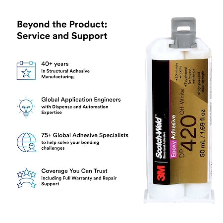 The 3M Scotch-Weld Epoxy Adhesive DP420 with MPN 7100148736 is a high-performance bonding solution designed for various materials. This off-white, two-part epoxy adhesive comes in a 50 mL Duo-Pak and is ideal for bonding plastics, rubber, metal, and more.