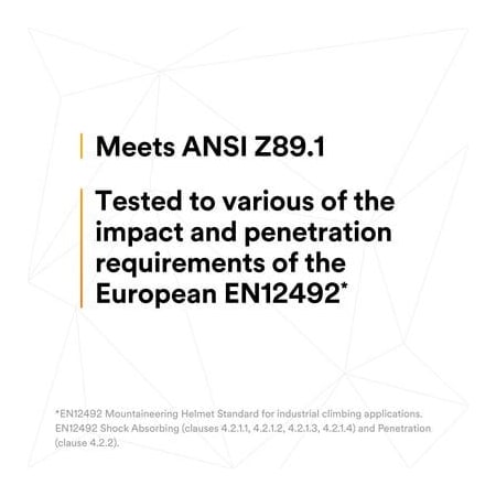 This helmet meets the ANSI/ISEA Z89.1-2014 Type 1 standards and includes features like a 6-point ratchet suspension system and an unvented design for optimal head protection in severe conditions.