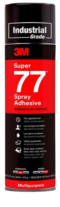 3M 77 Multi-Purpose Spray Adhesive is a versatile adhesive designed for various lightweight materials. It offers a fast-drying solution that creates a strong, permanent bond. This adhesive is easy to apply directly onto the surfaces needed, allowing for efficient project completion. The formula is designed to be photo safe, with no yellowing or soaking in over time.