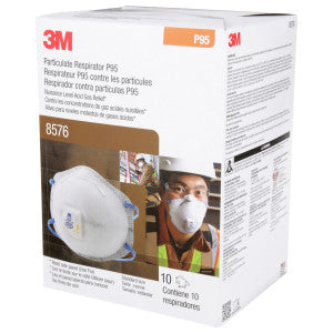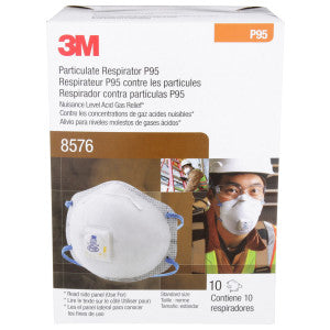 The 3M 8576 is a disposable P95 particulate respirator designed for respiratory protection against certain oil and non-oil based particles. This respirator includes a carbon layer to remove nuisance levels of acid gases.