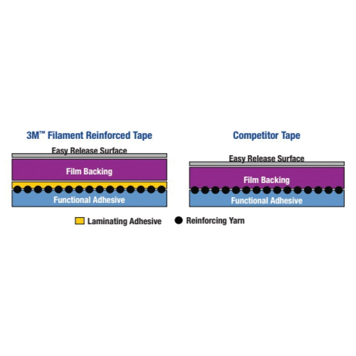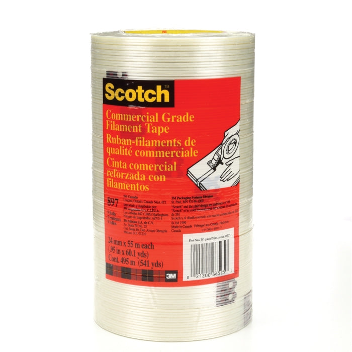 The 3M filament tape 897-24MMX55M is a reliable choice for various strapping, bundling, and reinforcing tasks. This tape features a synthetic rubber adhesive that adheres well to a range of surfaces including plastics, metals, and natural fibers. The fiberglass-reinforced design provides significant strength, making it suitable for medium-duty applications.