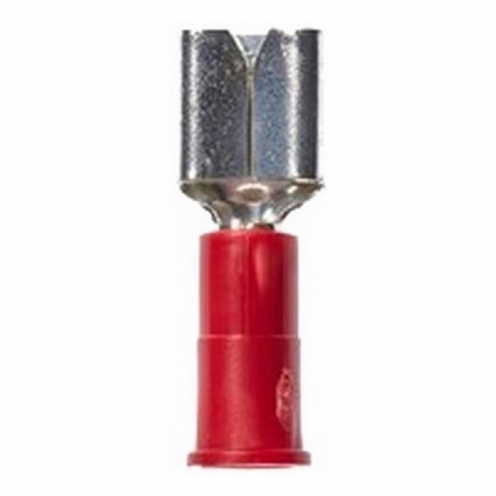 The 3M Highland FDV18-250Q is an insulated standard female disconnect terminal designed for use with conductors ranging from twenty-two to eighteen American Wire Gauge (AWG). This terminal features a butted seam barrel with a funnel-shaped, polyvinyl chloride sleeve for secure and efficient wire insertion. The terminal is compatible with tabs that are a quarter inch wide, making it suitable for various electrical applications.