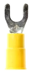 3M Highland FV10-8Q is an insulated standard fork terminal designed for use with 12 to 10 AWG conductors. The yellow terminal features a butted seam barrel construction that provides a secure fit on free-standing studs. The electrolytic copper material offers good conductivity, and the terminal is rated for temperatures between negative forty to two hundred twenty-one degrees Fahrenheit.