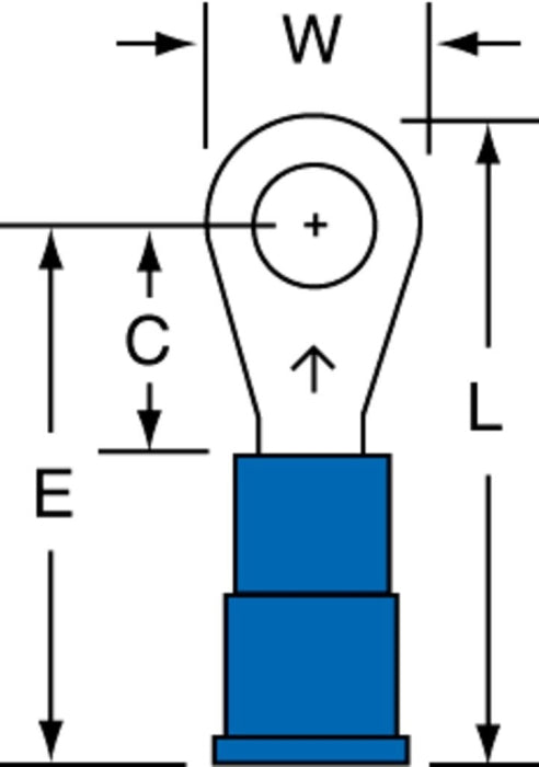 The 3M Scotchlok MV14-8R/LX is an insulated standard ring terminal designed for conductors ranging from sixteen to fourteen AWG. Its length is zero point ninety-three inches. The terminal includes a reliable brazed seam barrel, which provides a secure connection for electrical applications.