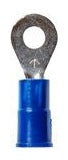 The 3M RV14-8L is a ring tongue terminal designed for wire sizes fourteen to sixteen AWG. This terminal features a blue vinyl insulation that provides a secure and reliable connection. The brazed-seam barrel helps ensure a stable fit while the funnel design allows for easy wire insertion. This terminal fits a #8 stud and is made from high-quality electrolytic copper for excellent conductivity.