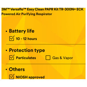 The 3M Versaflo TR-300N+ ECK is a high-efficiency powered air-purifying respirator system that is designed for ease of cleaning and maintenance. It is suitable for industries like pharmaceutical, healthcare, and food safety. This respirator provides effective protection against particulates.