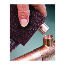 This maroon hand pad features aluminum oxide abrasives for effective cleaning and finishing. It can be used on metal, wood, plastics, ceramics, and more. The pad resists tearing and rusting, ensuring a long lifespan. It can be folded, stacked, or rolled for versatile use on flat, irregular, or contoured surfaces. The pad's performance is comparable to steel wool but without the risk of rust or splinters.