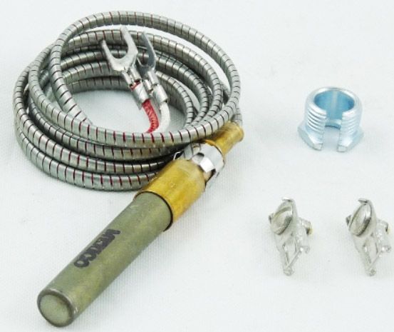 This Honeywell Q313A1055 Thermopile Generator is a replacement part designed to convert thermal energy into electrical energy. It provides a 750 millivolt output, features spade terminals for secure connections, and includes a 1/2 inch attaching nut for easy installation.