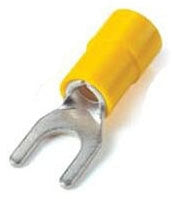 ABB TV10-14F-XV is a vinyl insulated fork terminal designed for use with 12 to 10 AWG wire. This terminal features a one-quarter inch stud size and is made from electrotinned copper for better conductivity and corrosion resistance. The compact design allows for efficient wire termination in various applications.