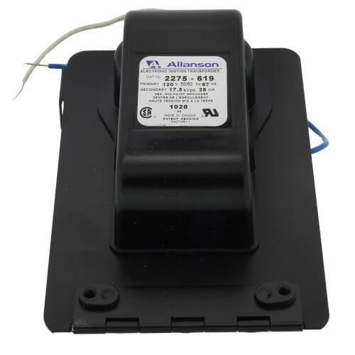 The Allanson 2275-619 is a solid state ignition transformer designed for the Wayne Hi Speed M/MH Burner. This transformer operates at a primary voltage of one hundred twenty volts and provides a secondary output voltage of seventeen thousand five hundred volts. It is suitable for use with various heating systems and meets both American and European noise emission standards. This product is CSA and UL listed, ensuring compliance with safety regulations.