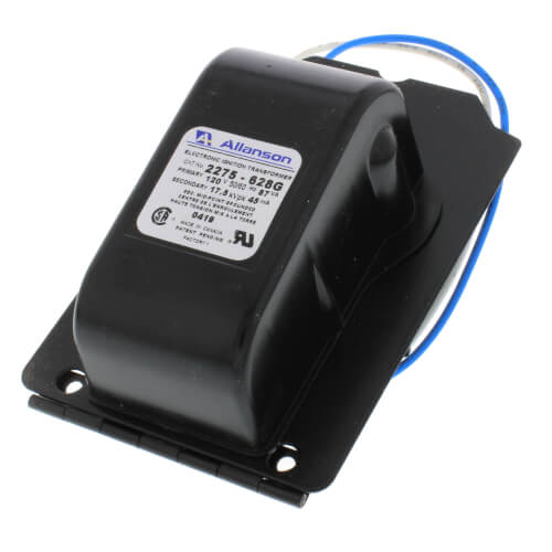The Allanson 2275-628G is a solid state ignition transformer designed for use with Becket A, AF, and AFG burners. This transformer operates at a primary voltage of one hundred twenty volts and has a secondary voltage of seventeen thousand five hundred volts. It features a current rating of forty-five milliamperes and a power capacity of one hundred fifty VA.