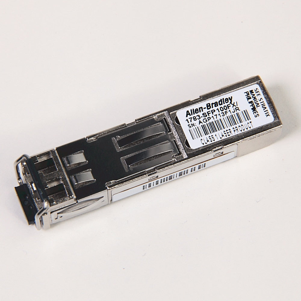 The Allen-Bradley 1783-SFP100FX Fiber Transceiver is designed for high-speed connectivity. This model supports one hundred megabits per second for multi-mode fiber and ensures reliable network communication. It is suitable for use with Stratix 5700, 8000, and 8300 network switches.