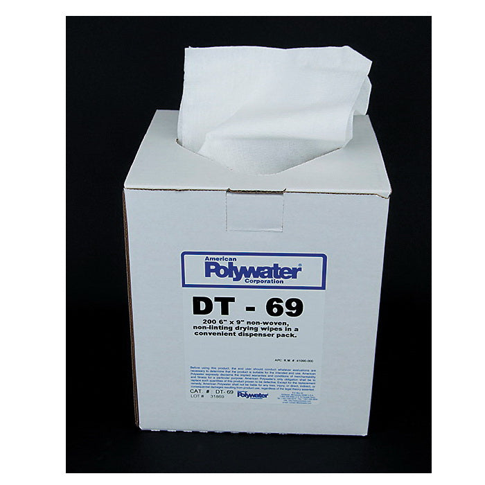 The American Polywater DT-69 is a dry wipe designed for wiping excess solvent from electrical cables during splicing. This product comes in a package of two hundred wipes. Each wipe measures six inches by nine inches and is made from a durable blend of spun lace polyester and wood pulp.