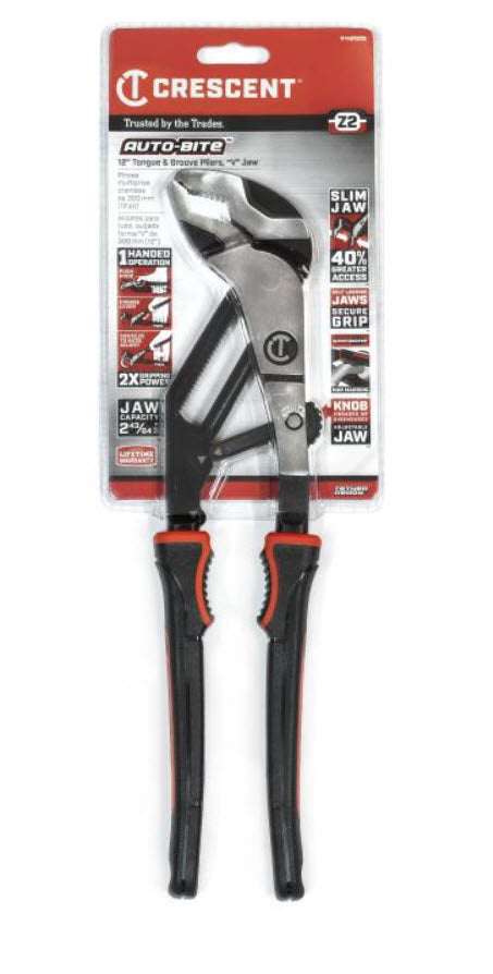 Apex Tool Group RTAB12CG Crescent Z2 Auto-Bite Tongue and Groove Pliers are designed for durability and ease of use. The Auto-Bite feature allows for quick adjustments, ensuring a precise grip each time. The handles are ergonomic, enhancing comfort during extended use.