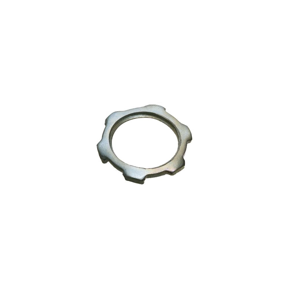 This conduit locknut effectively fastens threaded conduit to unthreaded openings, making it essential for secure electrical fittings.