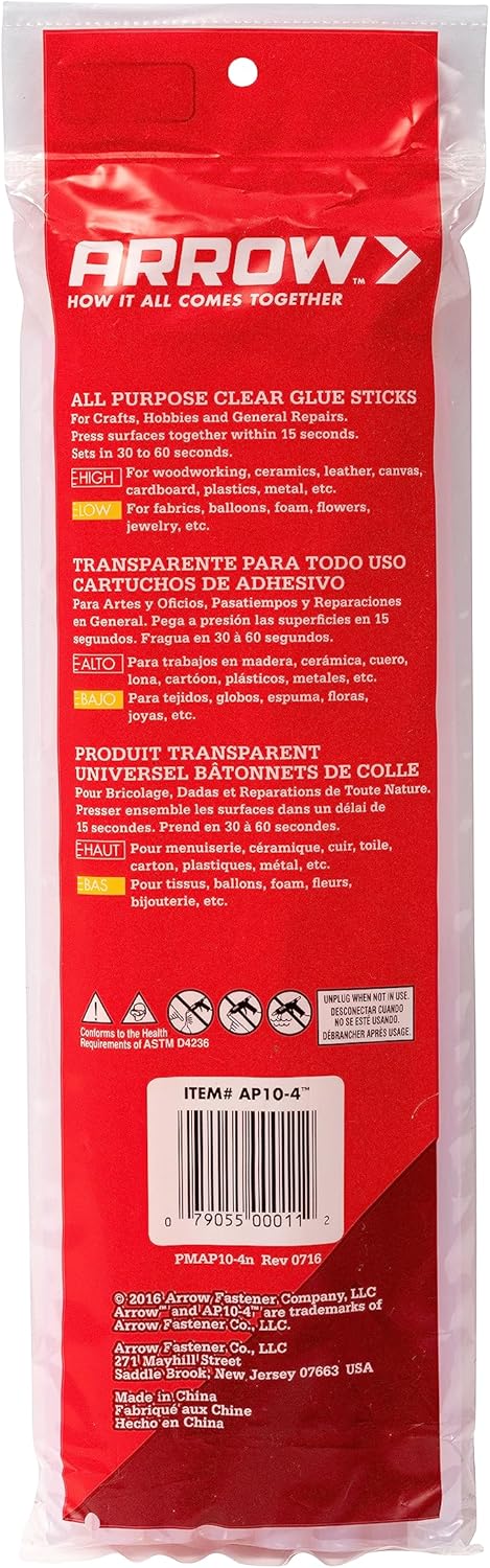 The Arrow Fastener AP10-4 All Purpose Glue Sticks are designed for hot glue guns. These glue sticks measure 10 inches by 1/2 inch and come in a pack of 12. They are suitable for high and low-temperature crafting, hobbies, and general repair projects.