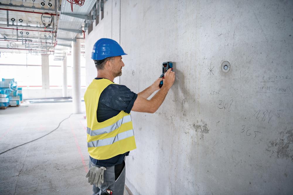 The Bosch DTECT200C 12V Max Wall/Floor Scanner utilizes radar technology for accurate detection of various materials. This advanced tool is not only a stud finder. It detects live and non-live cables, metal, plastic pipes, and wooden studs with precise depth indication.