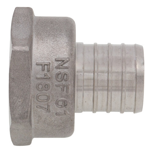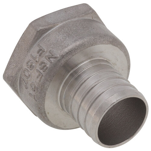 Boshart's SSPEX-FA10 is a stainless steel female adapter designed for PEX applications. This product connects one-inch PEX tubing to one-inch NPT threaded connections. It is suitable for both cold and hot water distribution systems.