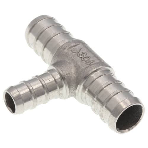 This stainless steel tee is designed to connect PEX tubing with size dimensions of one-half inch by one-half inch by three-eighths inch. It is compatible with ASTM F2159 PEX tubing and uses a crimp ring system for secure connections.