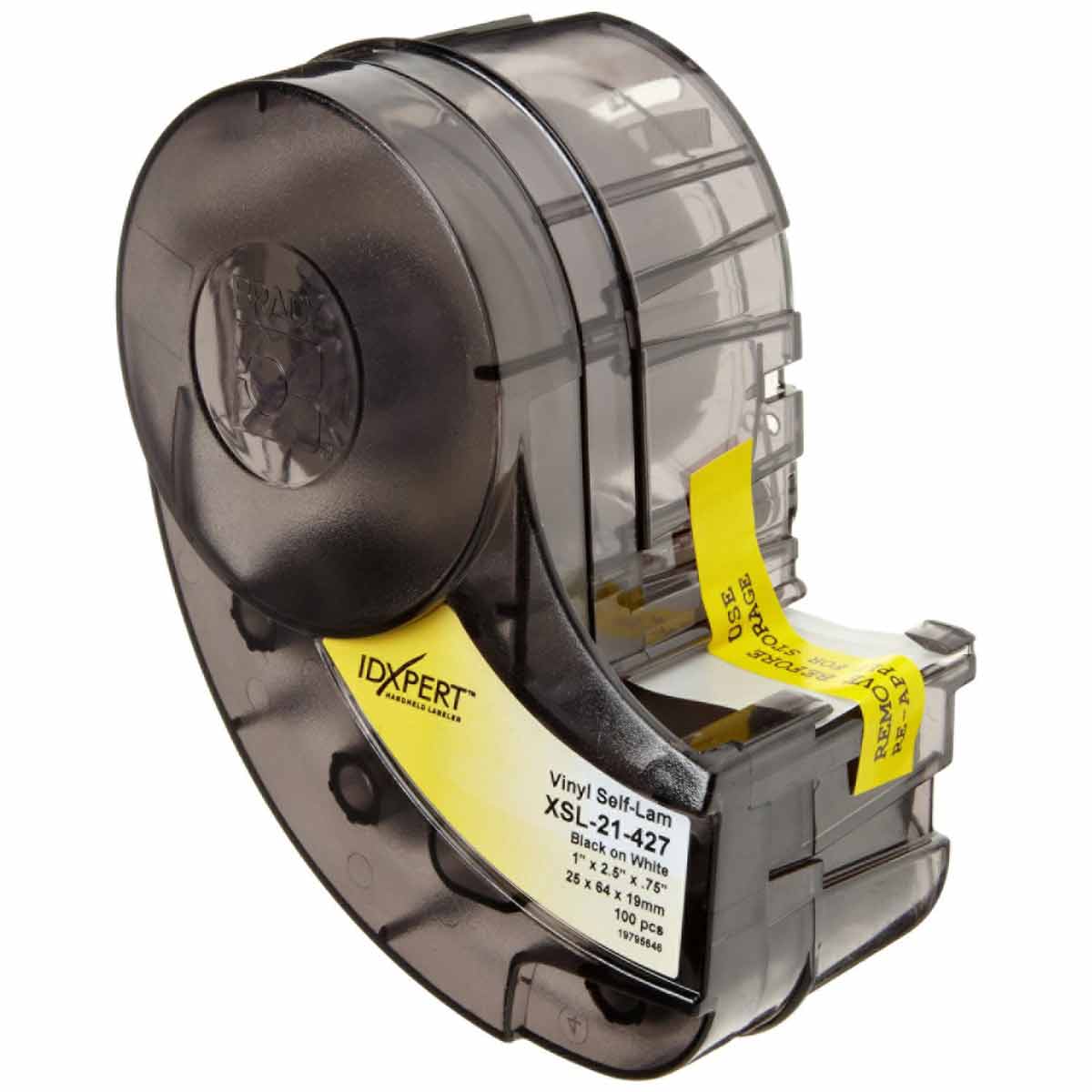 The Brady XSL-21-427 is a self-laminating vinyl wire label designed for use with the IDXPERT label maker. Each label measures two and a half inches in height by one inch in width. It is suitable for cable and wire marking, panel labeling, and voice and data identification.