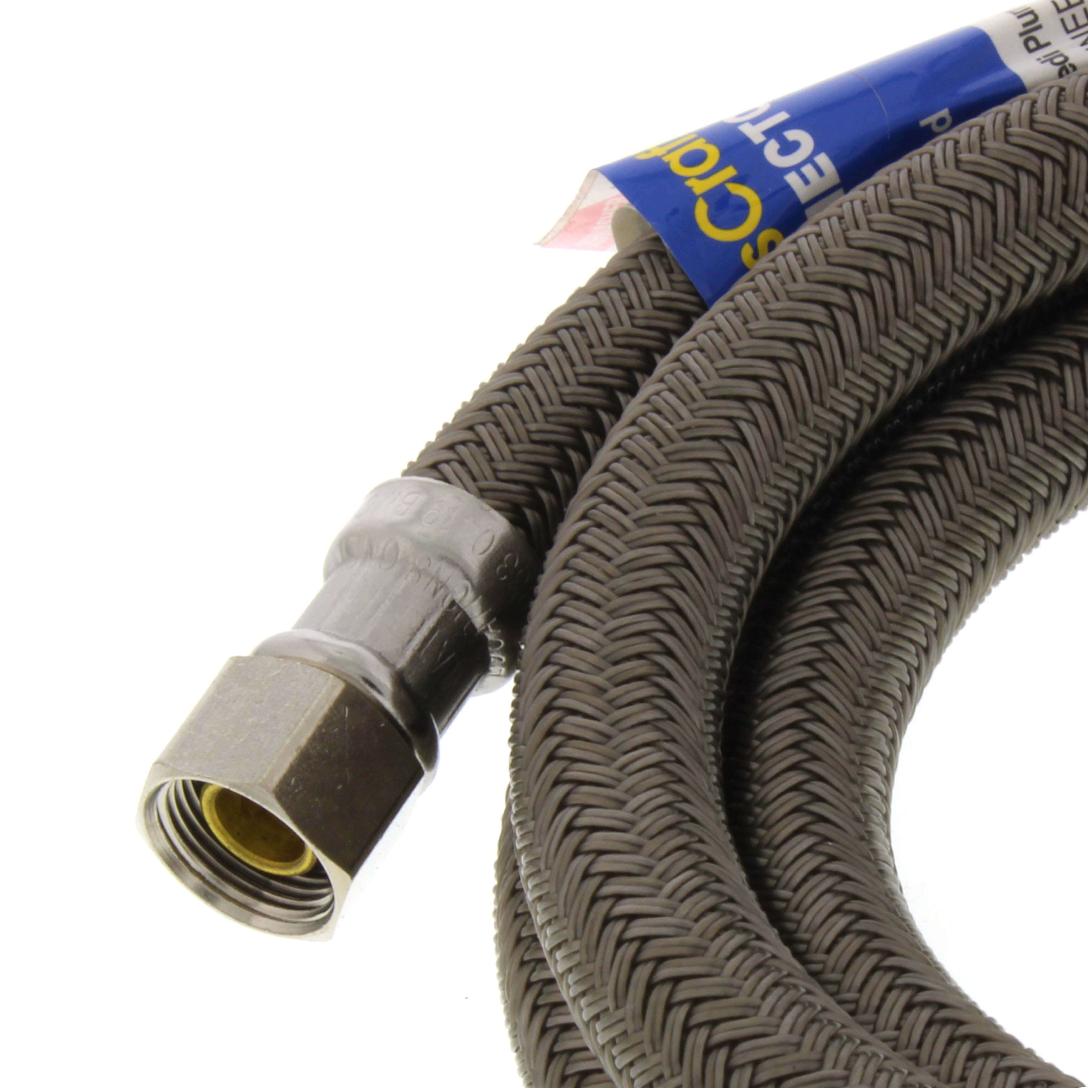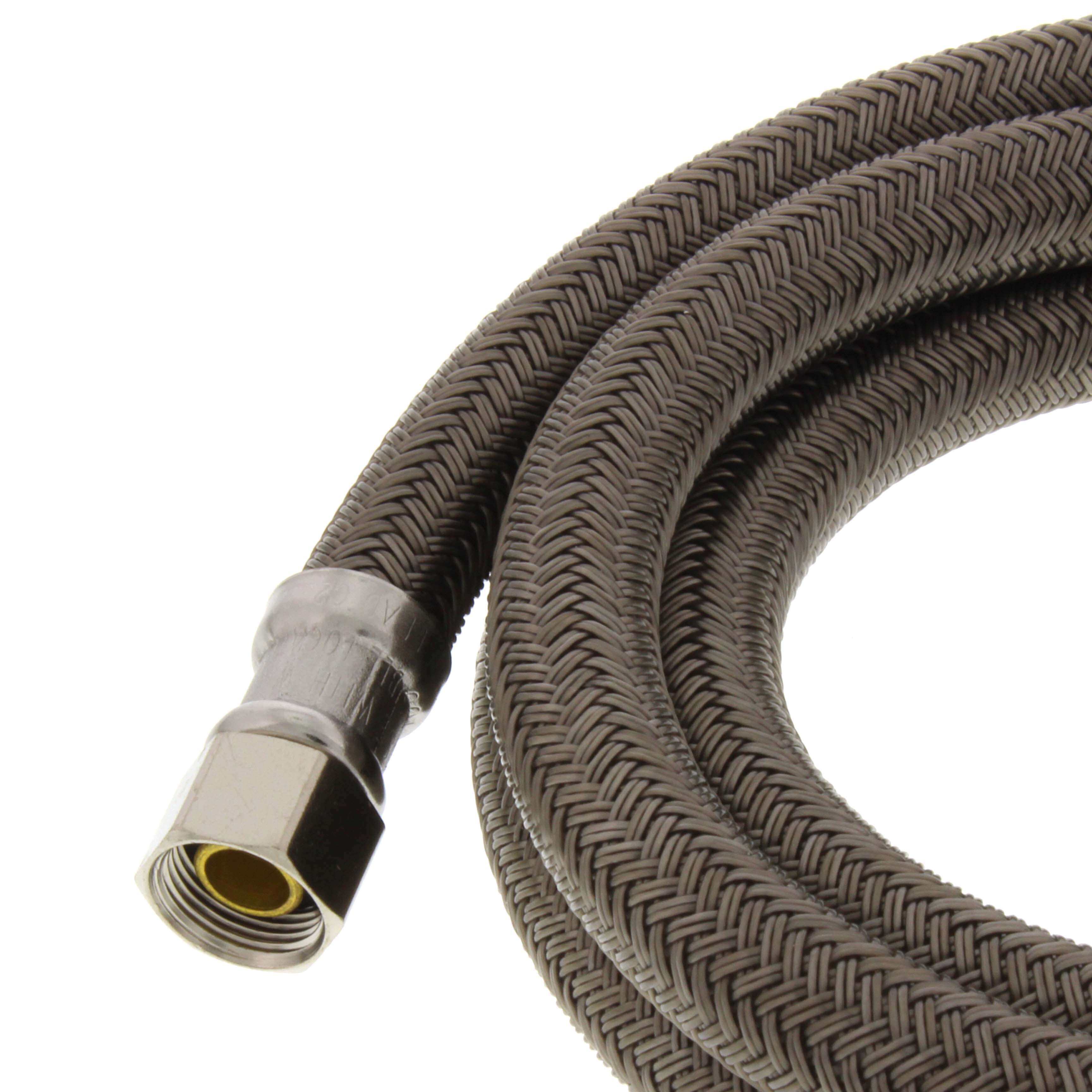 The BrassCraft B1-60DW12P is a 60-inch flexible braided polymer water connector with a garden hose elbow. Designed to connect the water supply to dishwashers, it features a compression inlet and outlet of three-eighths of an inch.