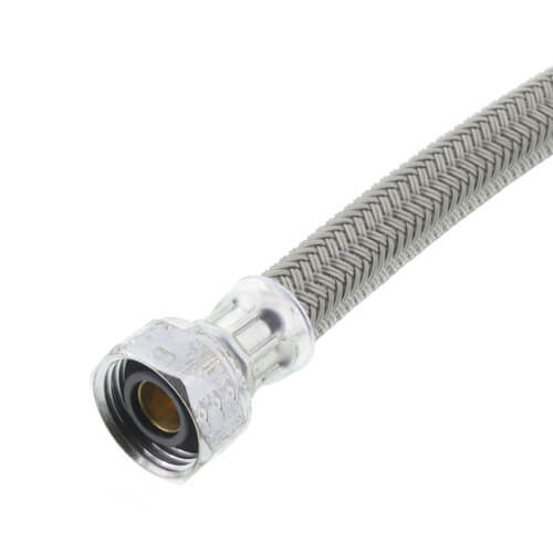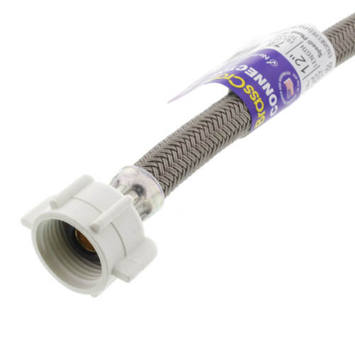 The Brasscraft B8-12DLF is a twelve-inch polymer coated braided hose faucet connector designed for use in potable water distribution systems. This connector features a half-inch female iron pipe inlet and a seven-eighths inch ballcock outlet. Its construction includes engineered polymer braided fibers that are flexible and resist kinking or crimping.