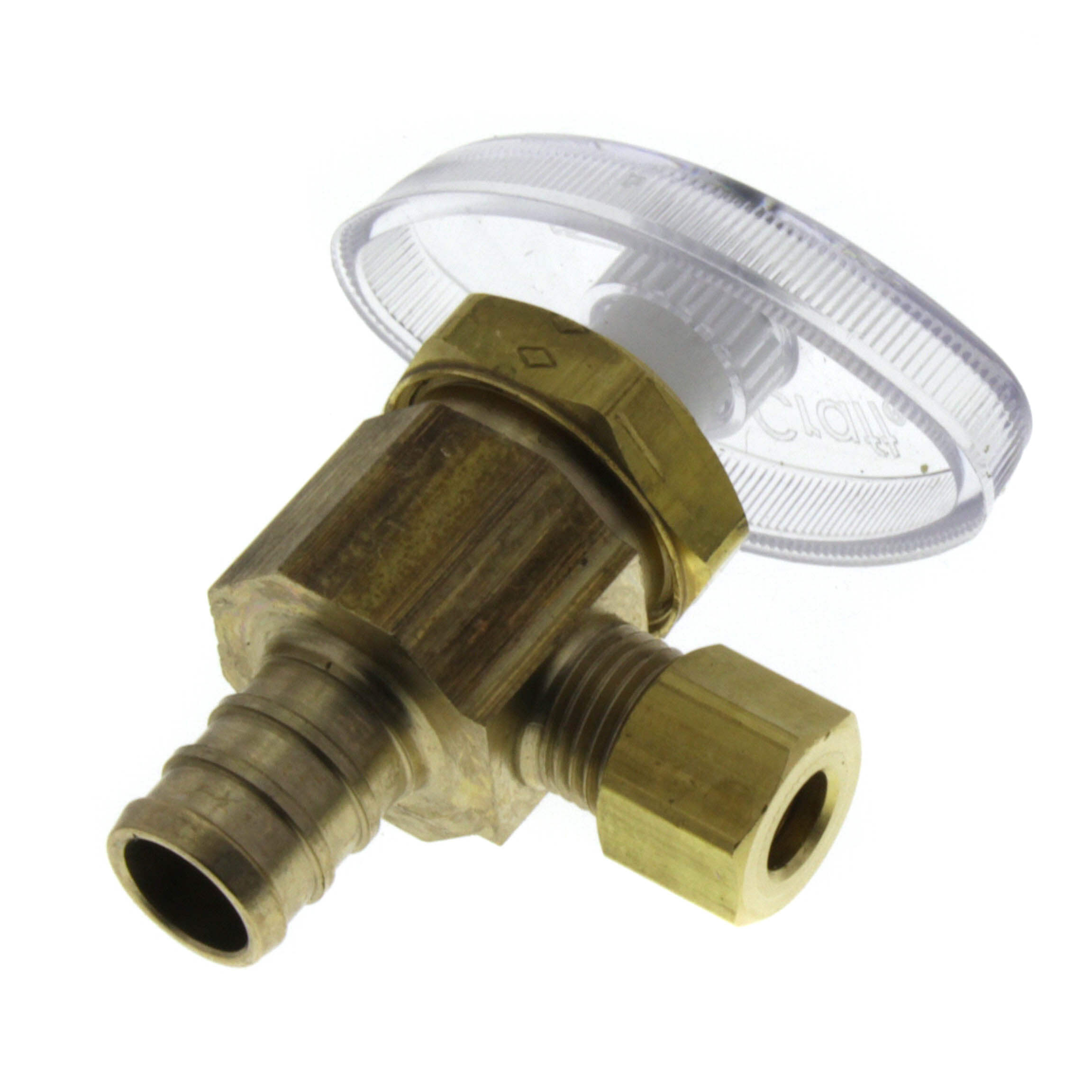 The BrassCraft BRPX09X-R Multi-Turn Angle Stop is a practical solution for controlling water flow in plumbing applications. Designed with a brass body, this valve combines durability with efficiency. It features a PEX crimp barb x compression design, suited for a variety of residential and commercial installations. This valve can handle a maximum pressure rating of 125 psi.