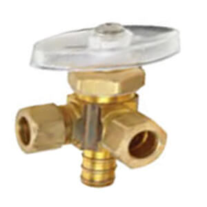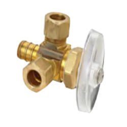 BrassCraft BRPX1901LRXR1 is a 1/2 inch nominal crimp PEX barb inlet x 3/8 inch OD compression x 3/8 inch OD compression dual outlet multi-turn valve. This valve is designed to control water flow to household plumbing fixtures. It allows for two independent supply lines to be attached to a single valve, making it ideal when adding dishwashers, ice makers, or instant hot water dispensers. The valve's multi-turn handle provides precise control over water flow, allowing maintenance without the need to shut off the entire home’s water supply.