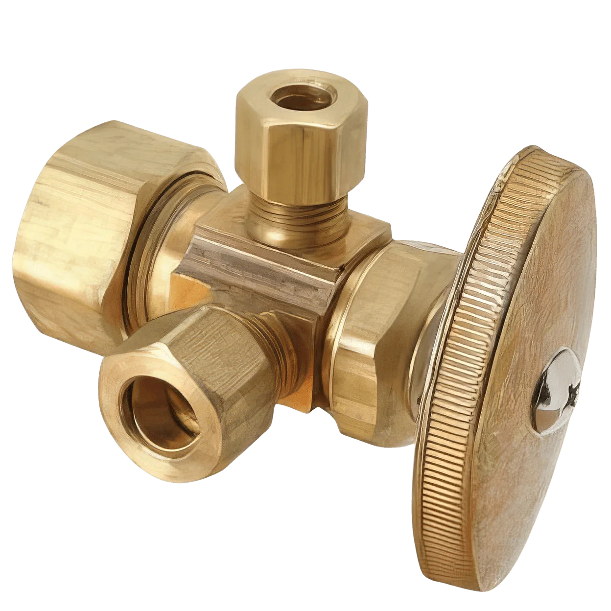 The BrassCraft CR1900RXR1 is a lead-free brass dual outlet angle stop valve designed for controlling water flow in residential plumbing systems. It features a nominal size of one-half inch by three-eighths inch outer diameter and one-quarter inch outer diameter. The compression connections provide a secure fit for copper piping. This valve incorporates a multi-turn shut-off mechanism for precise control, making it suitable for various applications in potable water distribution.