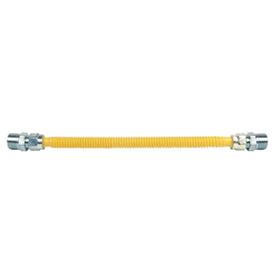 The BrassCraft ProCoat 3/4 MIP X 3/4 MIP X 24 fitting gas connector, identified by MPN CSSC11-24, is engineered for safety and reliability in gas appliance installations. This connector is suitable for use with natural gas, propane, and other gas types. It features a durable ProCoat polymer blend that protects against harsh chemicals and UV rays.