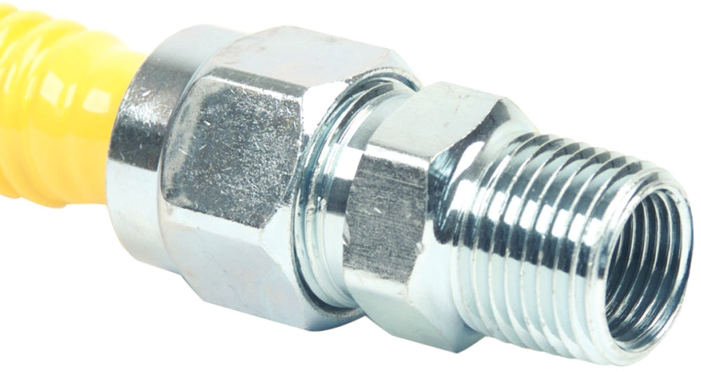 The BrassCraft CSSC44-36 is a flexible gas appliance connector with a length of thirty-six inches. It features 1/2 inch male threaded connections on both ends, made from polymer blend coated stainless steel. This connector is designed to endure harsh conditions while providing a secure connection for gas appliances.