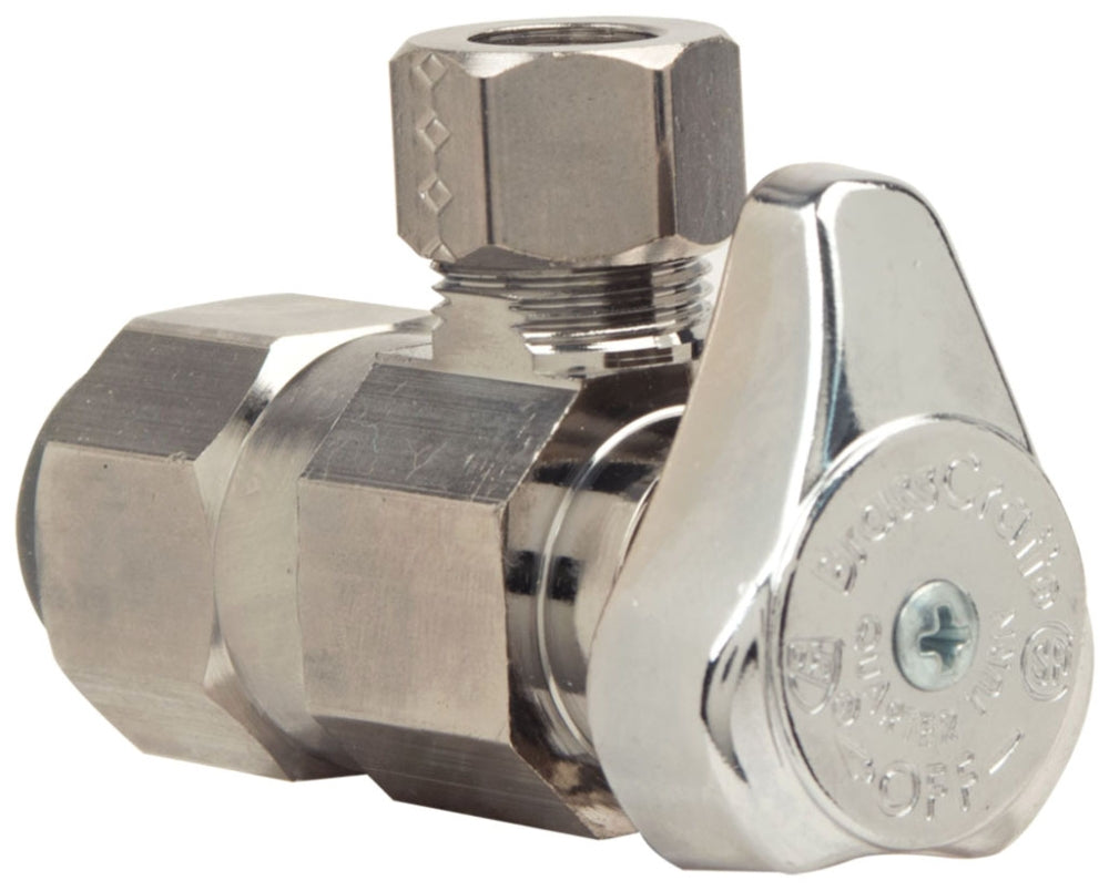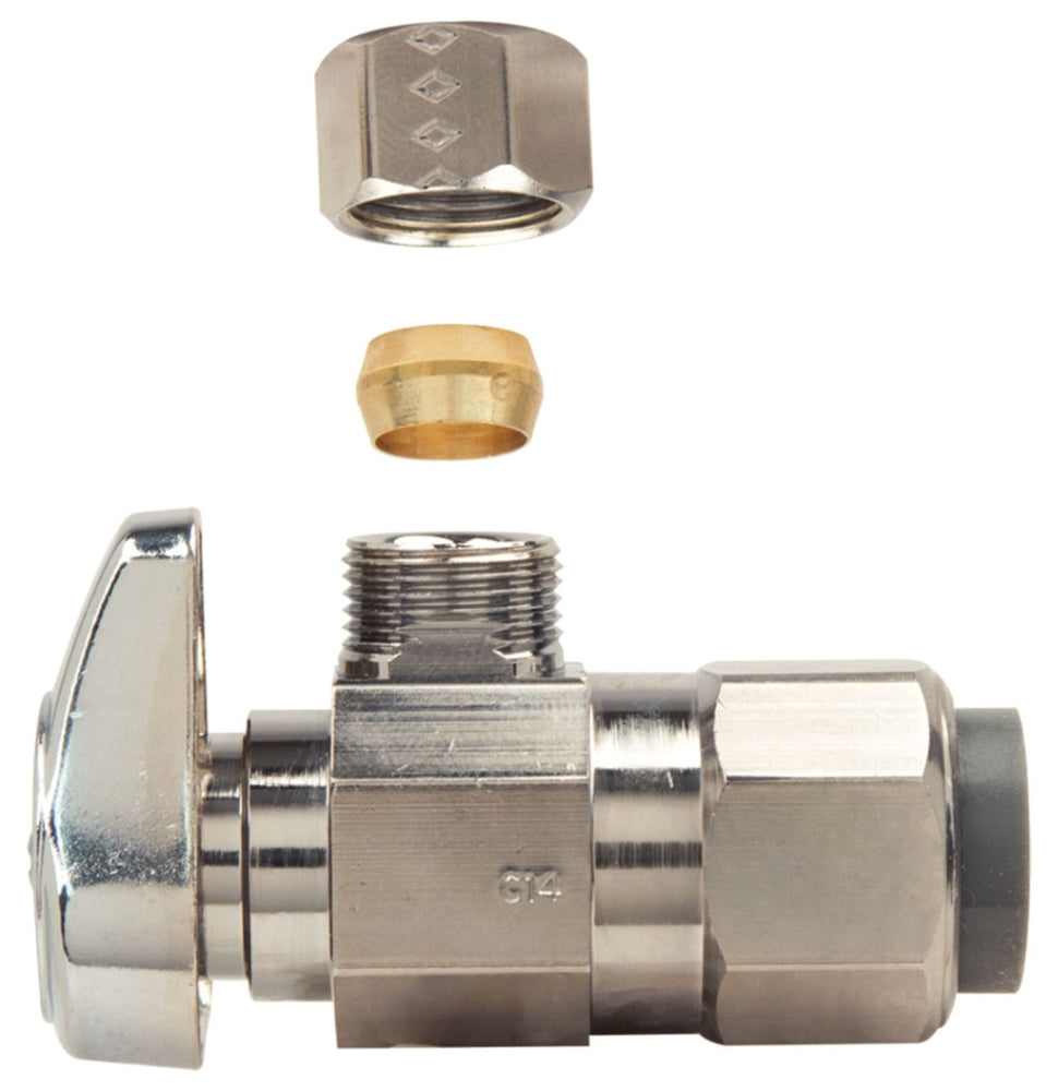 The BrassCraft G2PS19XC is a lead-free push connect angle stop valve designed for water supply applications. This valve features a 1/2 inch by 3/8 inch nominal size and operates with a 1/4 turn mechanism for easy shut-off. It is constructed from durable chrome plated brass, ensuring reliable performance and longevity.