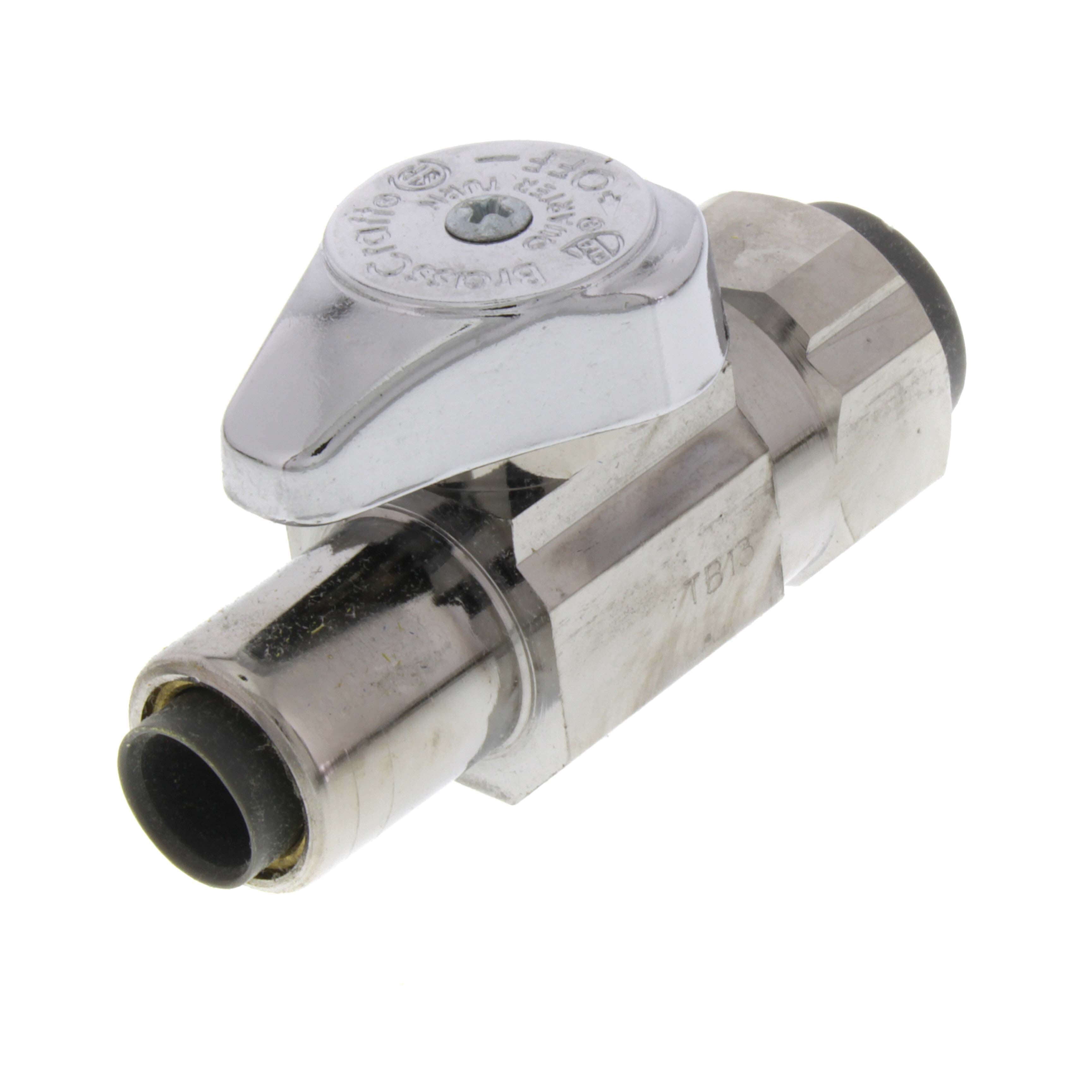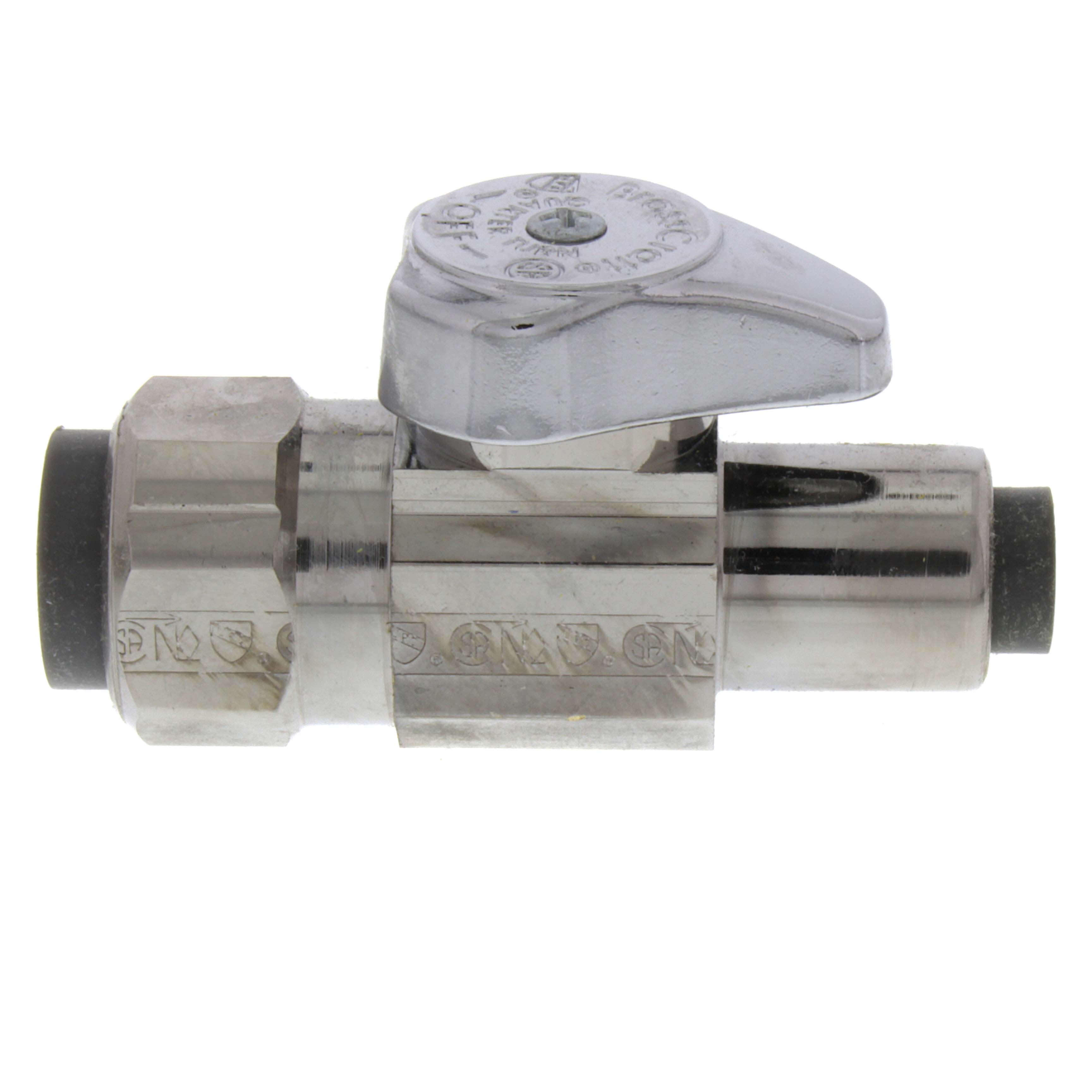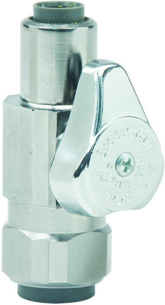 The BrassCraft G2QPS14X C is a push-to-connect supply stop valve designed for efficient water control. It features a half-inch nominal push connect inlet and three-eighth inches OD push connect outlet. This valve is chrome plated, providing a durable finish suitable for various plumbing installations.