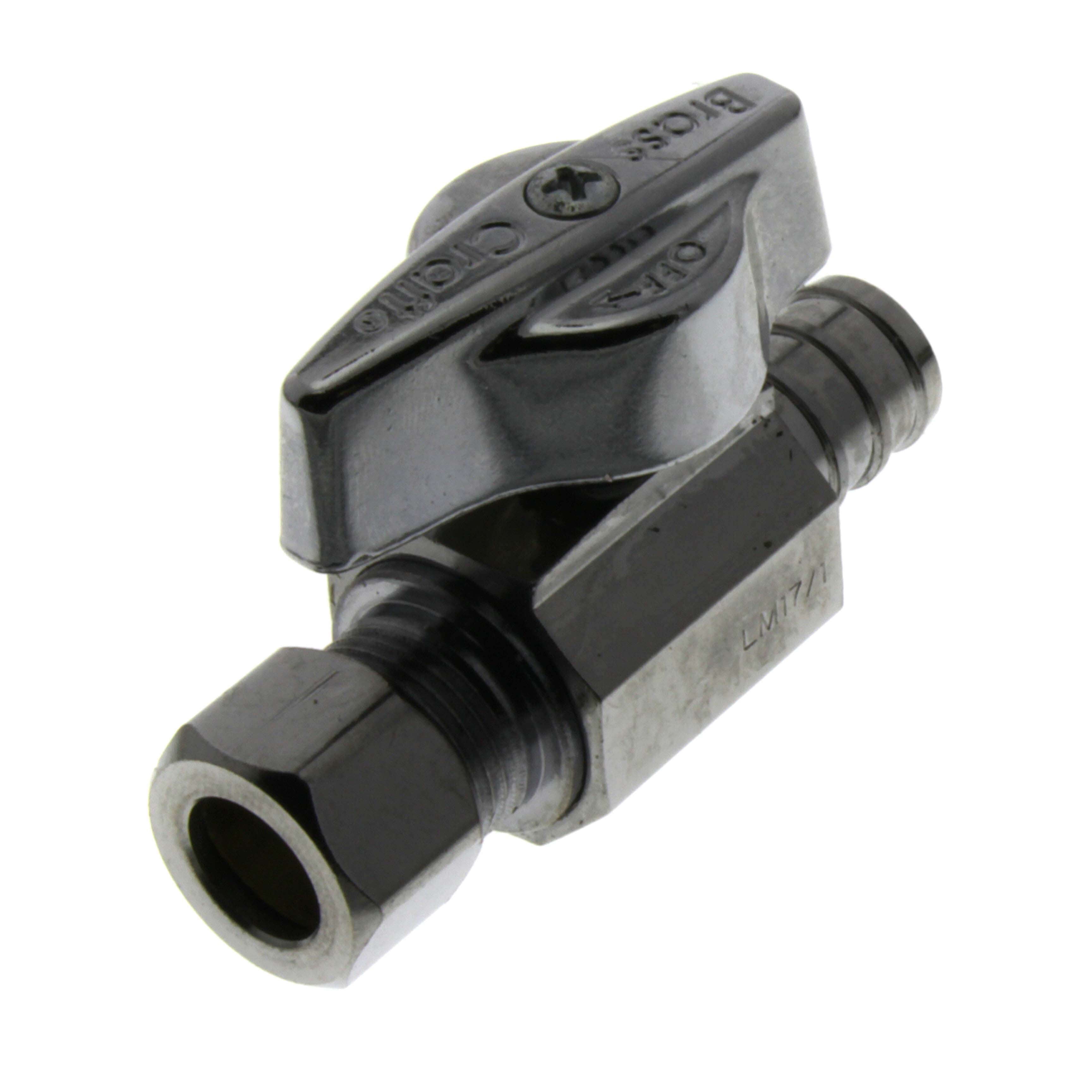 The BrassCraft KTBRPX14XC is a supply stop valve designed for effective flow control in plumbing systems. This valve features a half-inch nominal crimp barb inlet with a three-eighth inch OD compression outlet. Constructed of machined one-piece brass, it ensures durability and reliable performance. The chrome plating offers resistance against corrosion, making it suitable for long-term use.