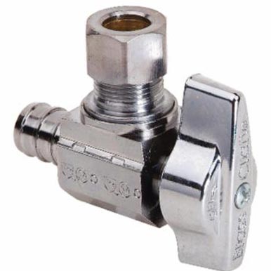 The BrassCraft KTBRPX19X C is a 1/2 inch PEX crimp x 3/8 inch OD compression ball handle angle supply stop valve. This valve is designed for use in potable water distribution systems. It connects with ASTM F876 PEX tubing, complying with ASTM F877 standards for water distribution systems.