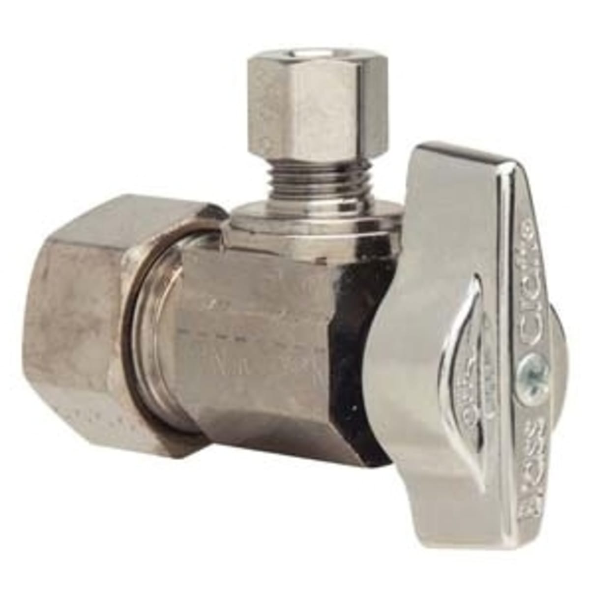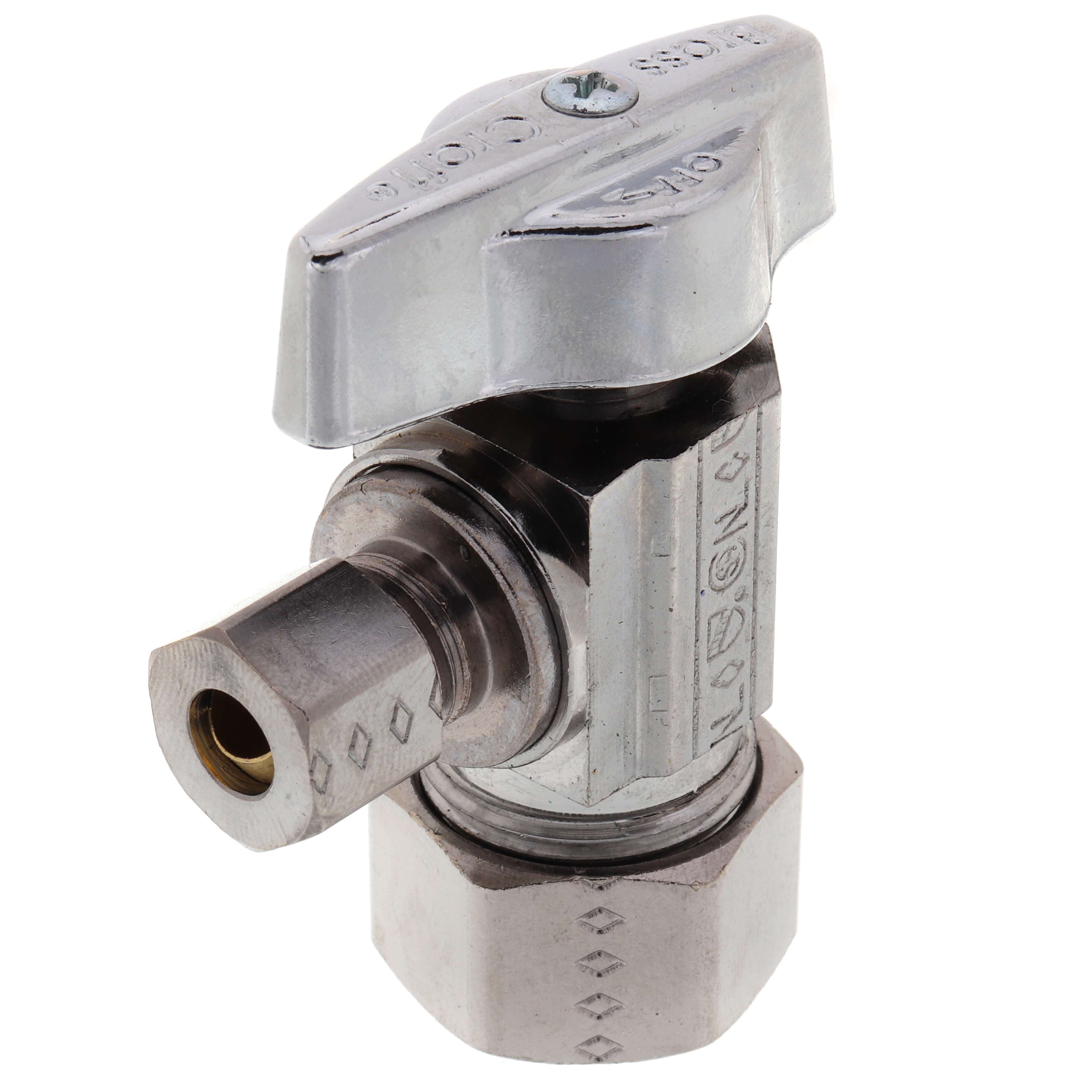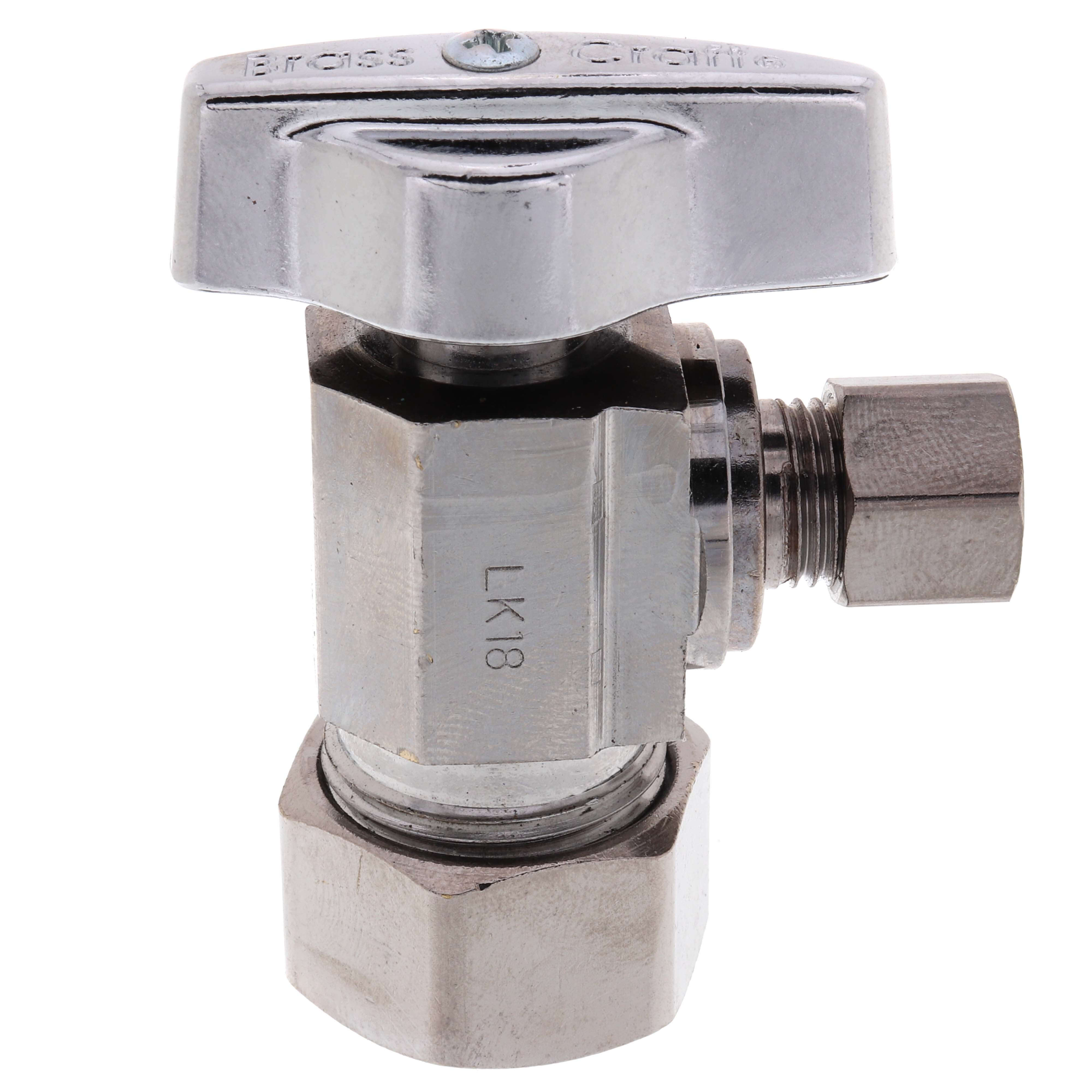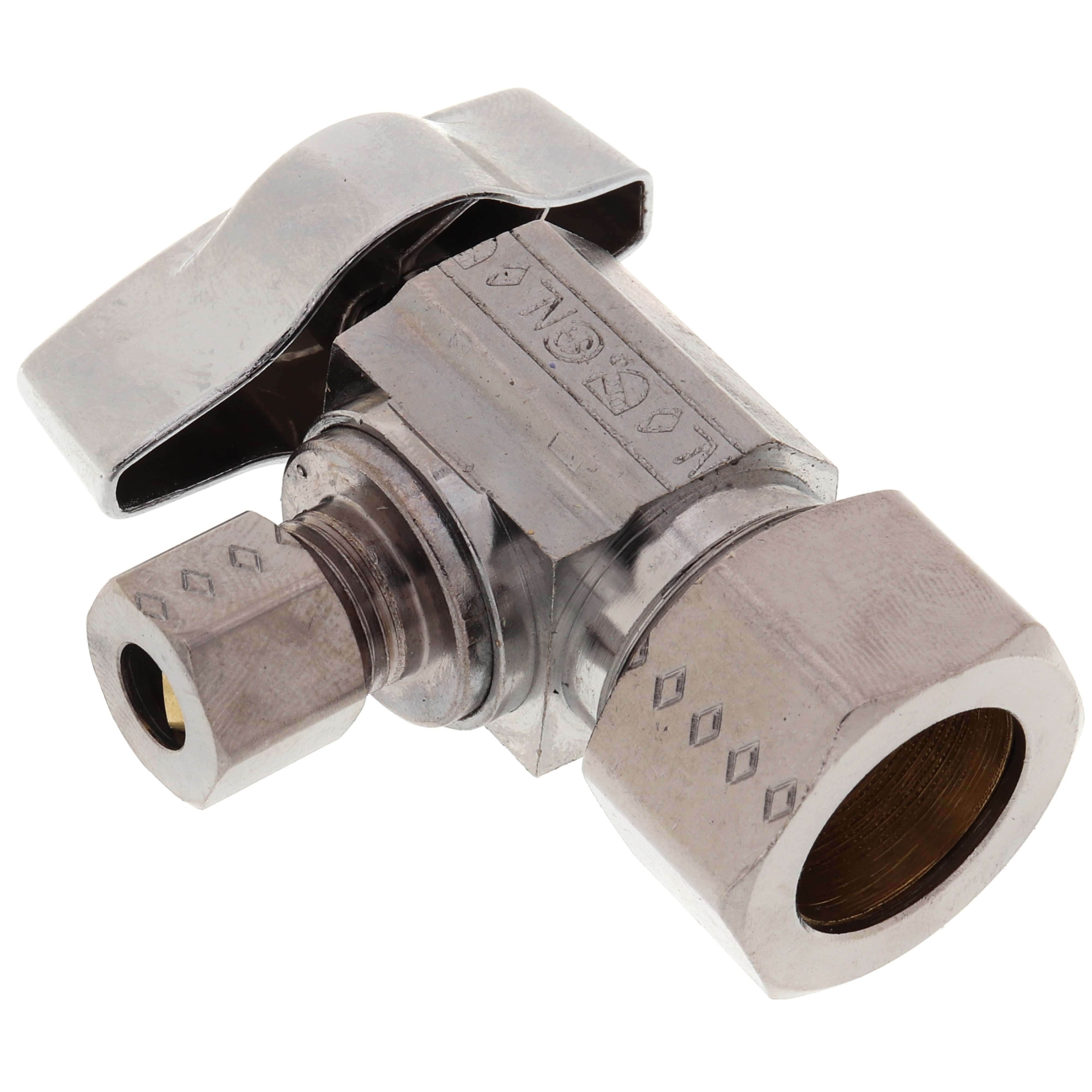 The BrassCraft KTCR09XC is a compression x OD compression angle supply stop valve. This valve is designed for reliable shut-off in potable water systems. It has a polished chrome finish and offers a robust construction for durability.