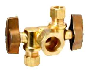 The Brasscraft KTCR1901DVXR1 is a 1/2 nominal compression inlet x 3/8 OD compression dual outlet angle ball stop valve. This valve is lead free and designed for potable water distribution systems. The precision-machined brass ball is paired with PTFE seats, allowing smooth operation without freeze-ups even after extended periods of non-use.