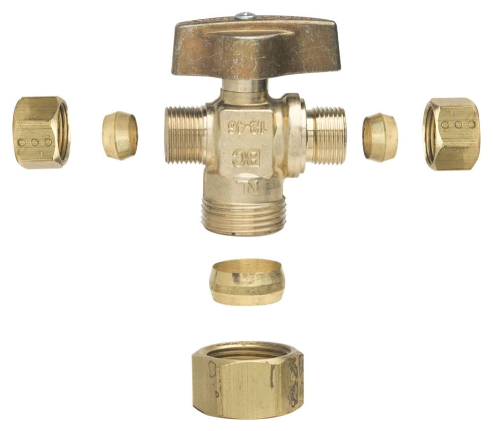 The BrassCraft KTCR1901XR1 is a 1/2 inch by 3/8 inch by 3/8 inch compression water supply stop. This valve controls the water flow to household plumbing fixtures and is ideal for residential and commercial water distribution.
