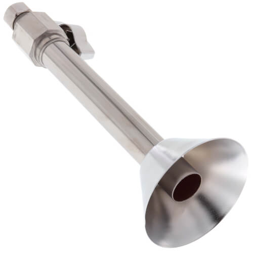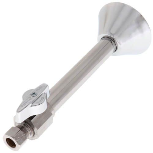 This straight supply stop valve includes a five-inch extension tube and is safe for use in locations with temperatures above 115 degrees Fahrenheit.