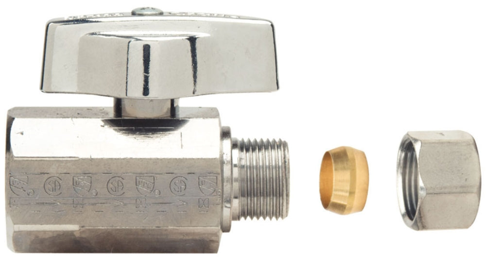 BrassCraft KTR12X-C is a water supply stop valve designed for reliable operation in potable water systems. This valve features a half-inch to three-eighths inch female threaded to compression connection, suitable for various plumbing applications.